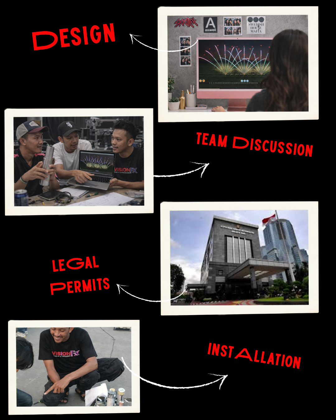 VISION FX menyediakan jasa desain kembang api dan pyro show. Menggunakan software desain kembang api terbaru, dengan hasil yang 89% menyerupai penapmilan pada saat show.Pemasangan kembang api ditangani oleh tenaga ahli bersertifikat dari POLDA dengan pengalaman lebih dari 10 tahun.